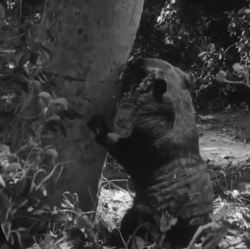 While the bear steals the show, if you pay close attention, you might spot something amusing: the bear handler can be seen peeking out from behind one of the trees.