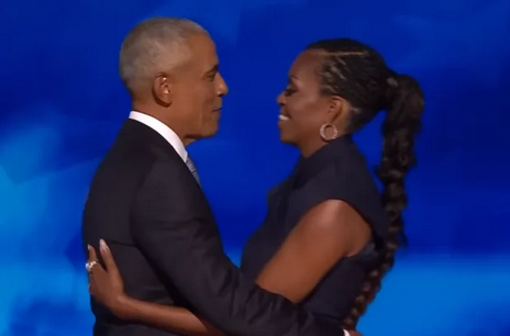 Michelle and Barack Obama hugging on a stage, Photo Credit: Inside Edition/Youtube