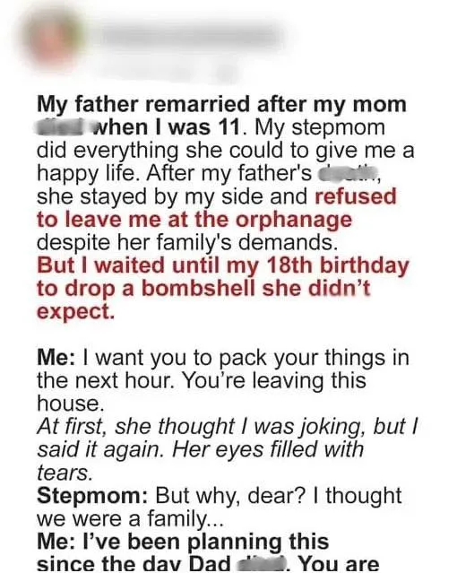 My stepmother looked at me with a mix of sadness and sympathy in her eyes. “I understand. You’re an adult now, you have money, and you no longer need me. But why do you send me so far away? You do not want to see me at all?
