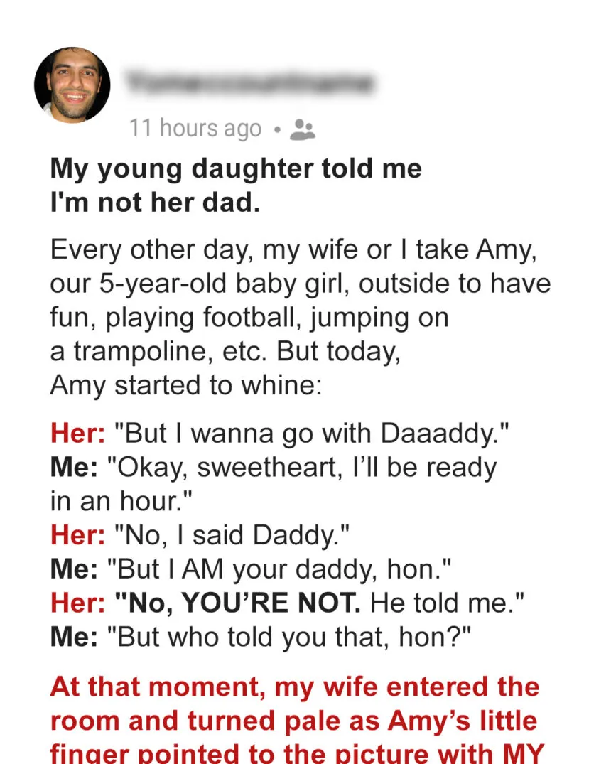 I’m still trying to process this, and honestly, I don’t know what to do. My little girl, Amy, who’s just five, dropped a bombshell on me that’s shattered my world. She said, “Daddy, you know you’re not my real daddy, right?” At first, I thought she was just confused or playing some kind of game. Kids have wild imaginations, after all. Or maybe she’d picked up something strange from TV. I laughed it off, trying to correct her gently, but the look in her eyes stopped me cold. There was something unsettlingly serious about her statement.