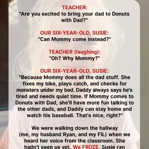 That moment came at Susie’s “Donuts with Dad” event at school. As they approached the classroom, Mrs. Powell asked Susie whom she’d invited. Without missing a beat, six‑year‑old Susie called out, “Can my Mommy come instead? She fixes my bike, throws the ball with me, checks under my bed for monsters—and Daddy just needs quiet time.”