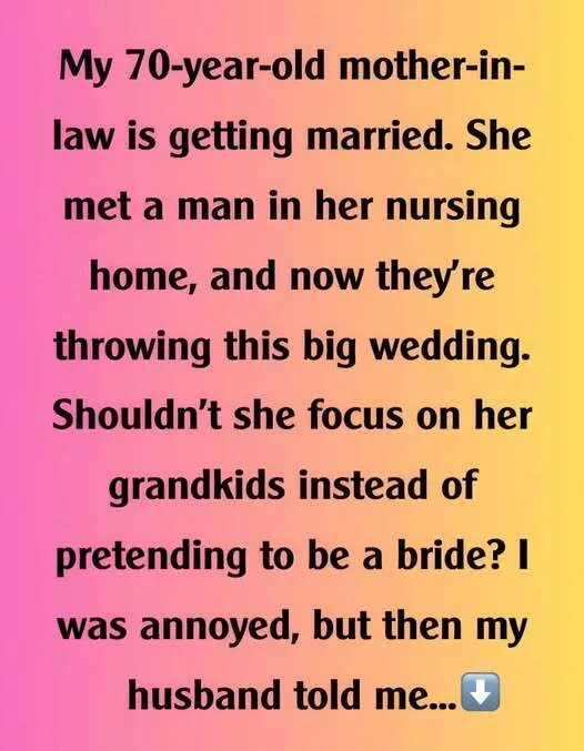 I was annoyed, thinking she was making a fool of herself, but then my husband sat me down. He told me that the man she’s marrying isn’t just a random nursing home fling.