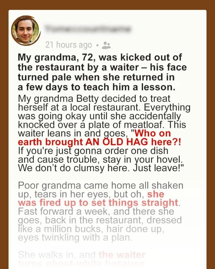Days later, as our family gathered at the restaurant for the celebration, the same waiter served us — I saw my grandmother’s face fall when she realized who it was.