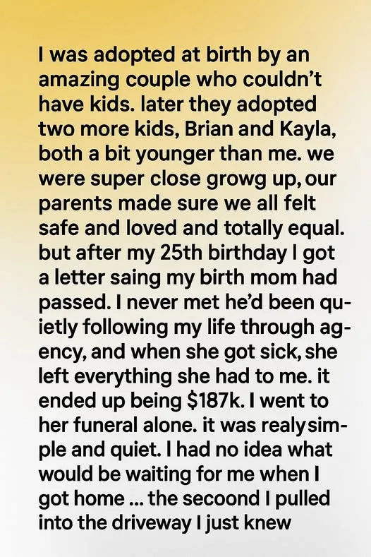 Growing up, I always believed I was one of the lucky ones. I was adopted as a baby by loving parents and later gained two adopted siblings, Brian and Kayla. We were told we were all “chosen” and equal, and for years, I believed it. On my 25th birthday, everything changed. I received a letter from a lawyer: my birth mother, Alina, had passed away and left me her entire estate — $187,000. I was overwhelmed with emotion and expected my family to support me.