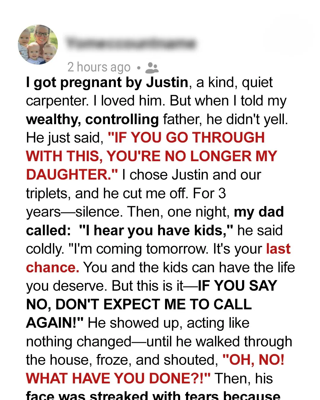 For the first time in years, we talked. He apologized for his pride and the years we’d lost, and I forgave him. When the triplets toddled into the room, curious and giggling, he knelt down, his eyes wide with wonder.