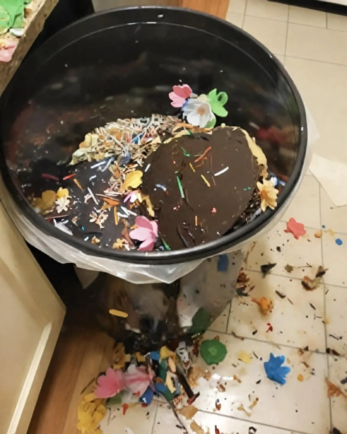 I rushed to the trash bin and peered inside. There it was—my creation, ruined beyond saving. My chest tightened as emotions welled up.