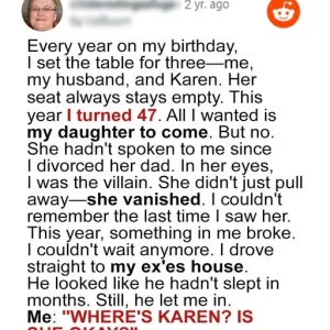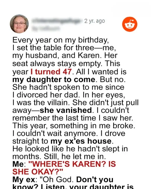 I set the table for three on my 47th birthday—like I had for the past two years—knowing one seat would stay heartbreakingly empty. That empty chair belonged to my daughter, Karen, who had cut off all contact. The silence had hardened into grief, but that night, a forgotten card in an old drawer shattered everything I thought I knew.