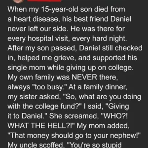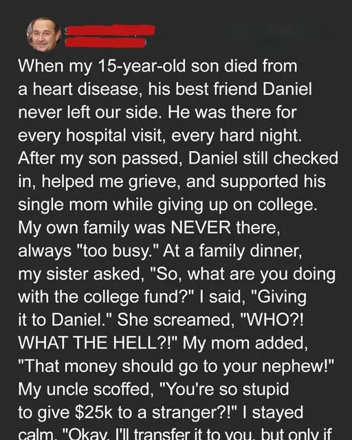 Rebecca sputtered, “What? That friend of Ben’s?” Uncle Will fretted, “Twenty‑five thousand dollars—really?” But I held firm. “He never left my son’s side. None of you did.”