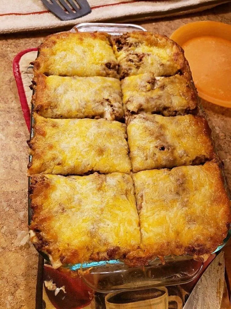 - Repeat the layers, starting with another tortilla, the remaining beef mixture, the remaining sauce, and another one-third of the cheese.