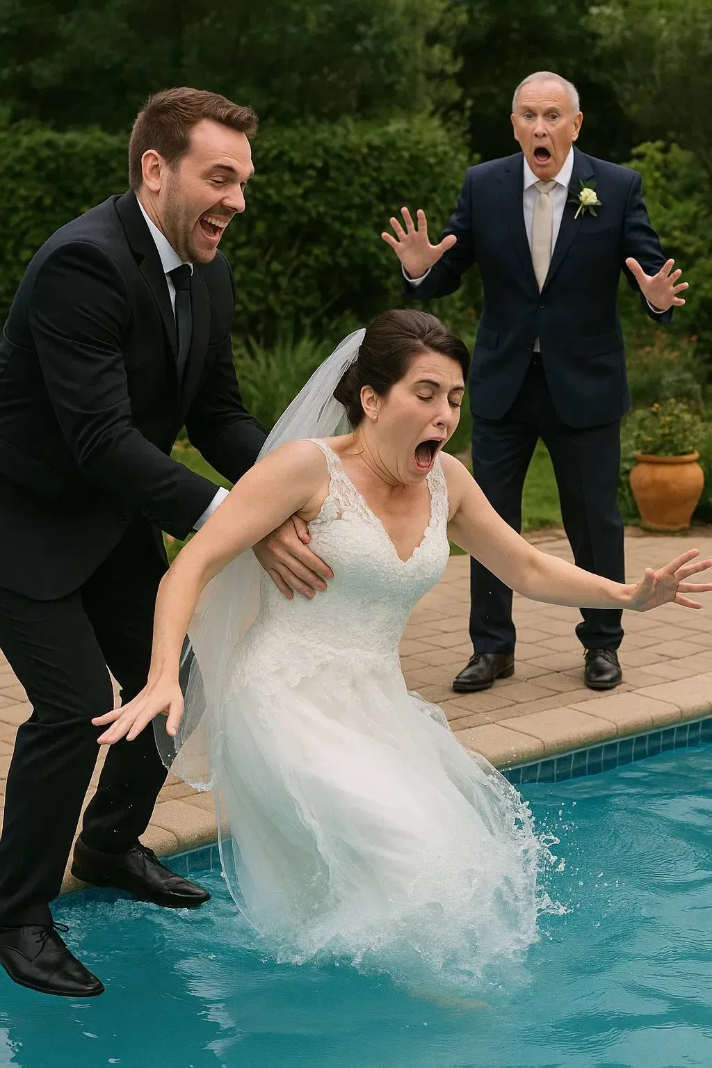 My dress had taken six months to make—white tulle, pearl buttons, intricate embroidery stitched with love. The reception flowed with laughter and music until the photographer suggested we take romantic photos near the pool outside.