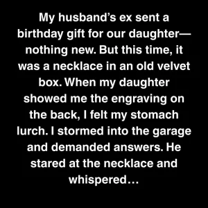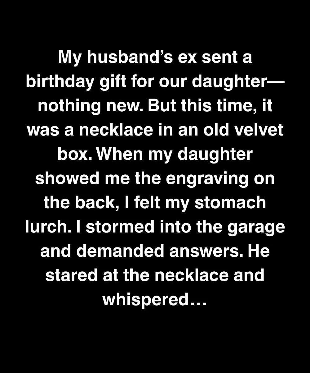 My husband’s ex sent a birthday gift for our daughter—nothing new. But this time, it was a necklace in an old velvet box. When my daughter showed me the engraving on the back, I felt my stomach lurch. I stormed into the garage and demanded answers. He stared at the necklace and whispered, “I never thought she’d keep it.”