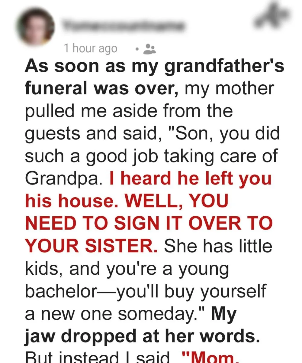 My Mom Demanded I Give the Inherited House to My Sister After Grandpa’s Funeral — What She Did Next Forced Me to Teach Her a Lesson