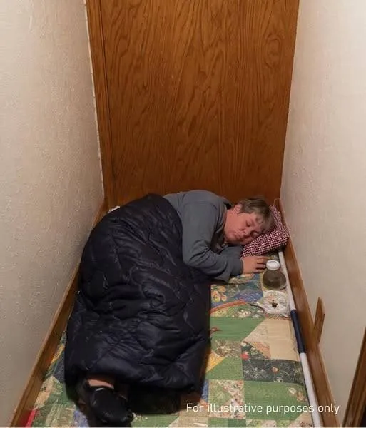 Then I saw. Behind her, a small camping mat with a scratchy blanket and no pillow was uncomfortably jammed between a broom closet and a bathroom door.