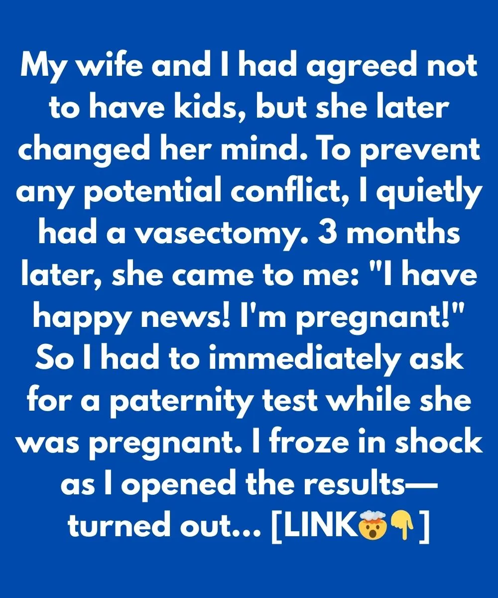 3 months later, she came to me proudly announcing: “I have happy news! I’m pregnant!” I was absolutely shocked and accused her of cheating, still without revealing my vasectomy. She thought my accusations were baseless and that I was losing my mind because I had been against having babies. Anyway, I asked for a paternity test during her pregnancy, leaving her no choice but to agree.