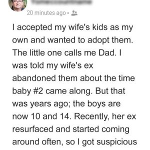but he replied that his mother might still like him. The boy then revealed that he often saw his mother cuddling with his father. He shared that he used to find him at home when he returned from school.That weekend, OP talked to his wife’s ex when he visited his children.