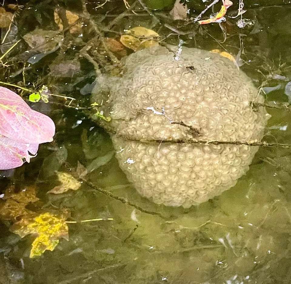 The strange, sticky-looking sacs, which seem to contain thousands of eggs, are found underwater and are usually affixed to a rock, branch, or dock.