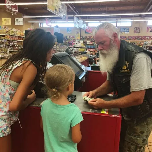 The cashier started removing items when a weathered hand stopped her. The biker had been standing three people back in line. Now he was right beside Sarah, his wallet already open.