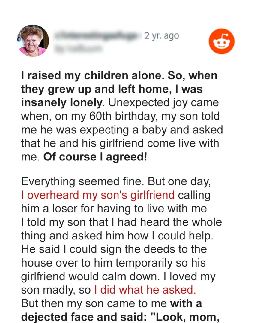 “Mom, how about you sign the deed of the house over to me, just temporarily, so Debby can feel secure?” he suggested. Gina was hesitant but she didn’t want to say no to her boy. After all, she could trust her son, couldn’t she?