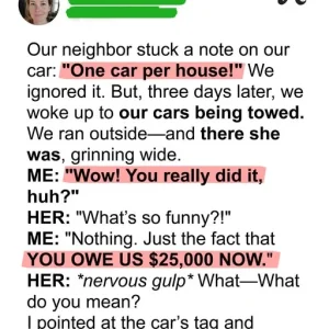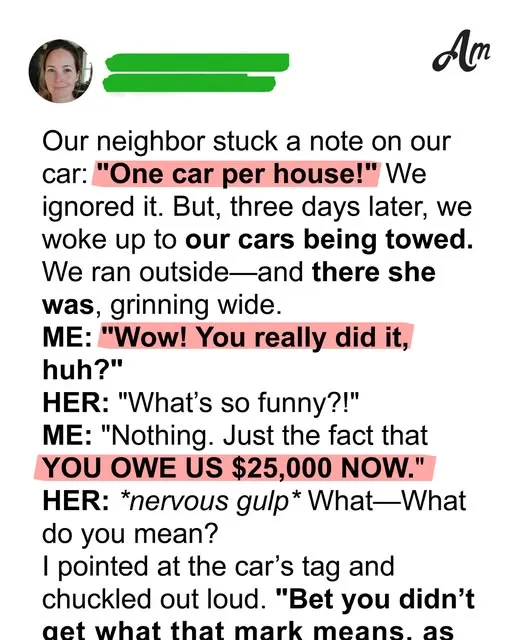 She smiled as our cars were hauled away, convinced she had won some neighborhood battle. But by the next morning, she was standing on her porch in shock, facing a $25,000 mistake she’d never forget.