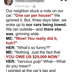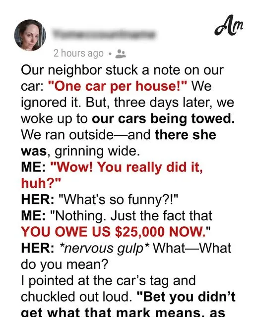 She smiled as our cars were hauled away, convinced she had won some neighborhood battle. But by the next morning, she was standing on her porch in shock, facing a $25,000 mistake she’d never forget.