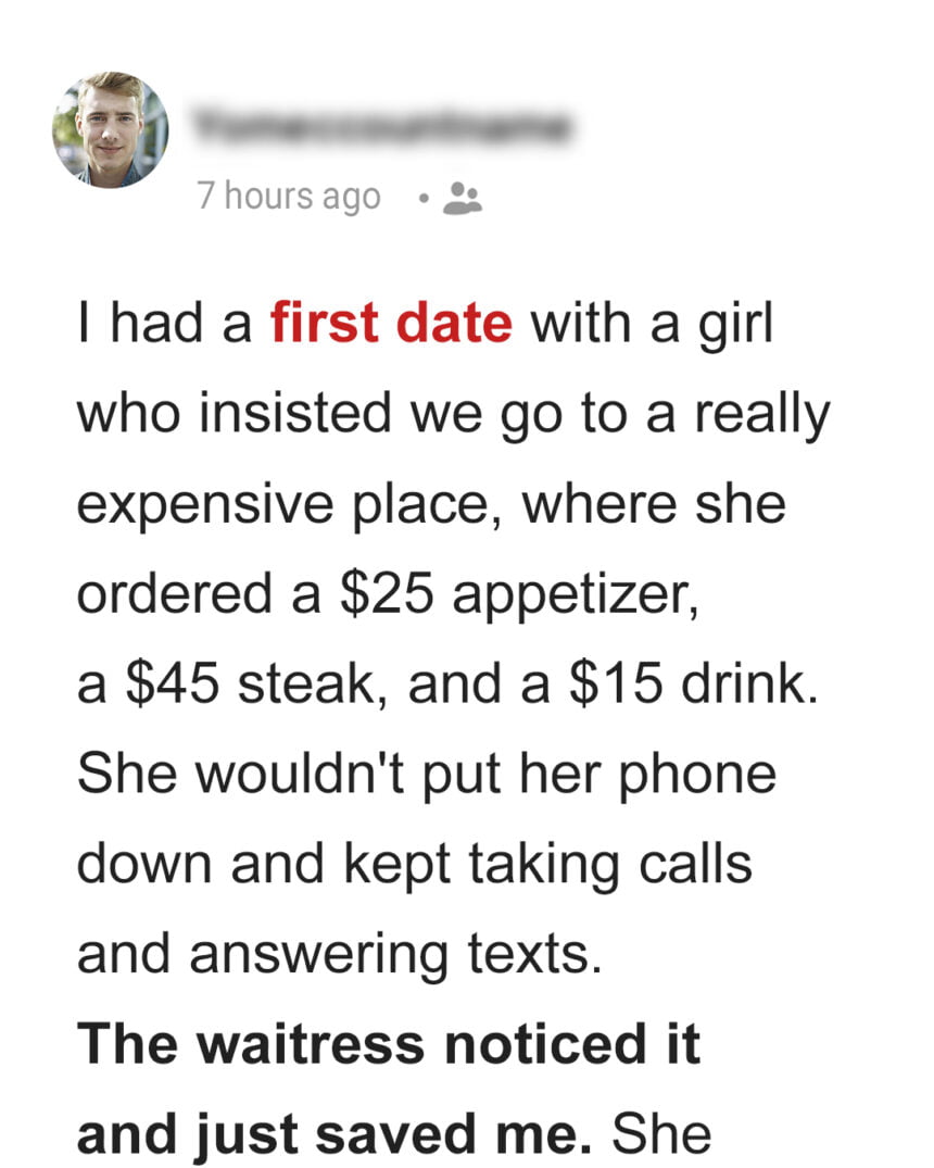 2. Making the Exit A Reddit user recalled his first date with a girl who insisted on dining at an exceptionally pricey restaurant, where she ordered a $25 appetizer, a $45 steak, and a $15 drink.
