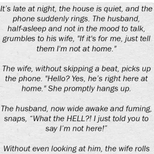 Without even looking at him, the wife rolls her eyes and says, “Relax and shut up. The call was for me.”