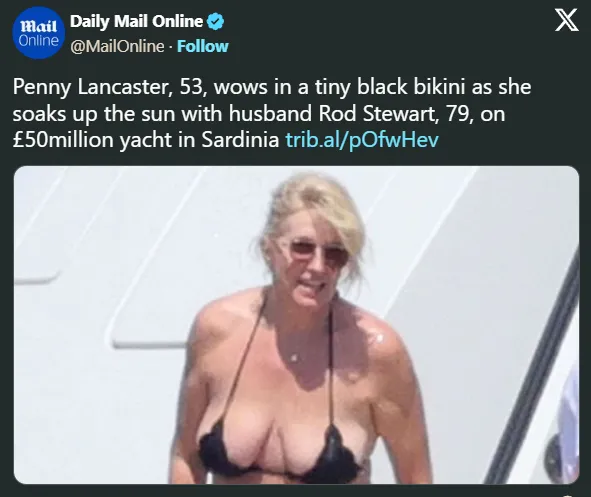 Rod Stewart’s wife Penny Lancaster has been drowning in criticism after she was spotted wearing a teeny-weeny bikini on a yacht off the coast of Sardinia, Italy.