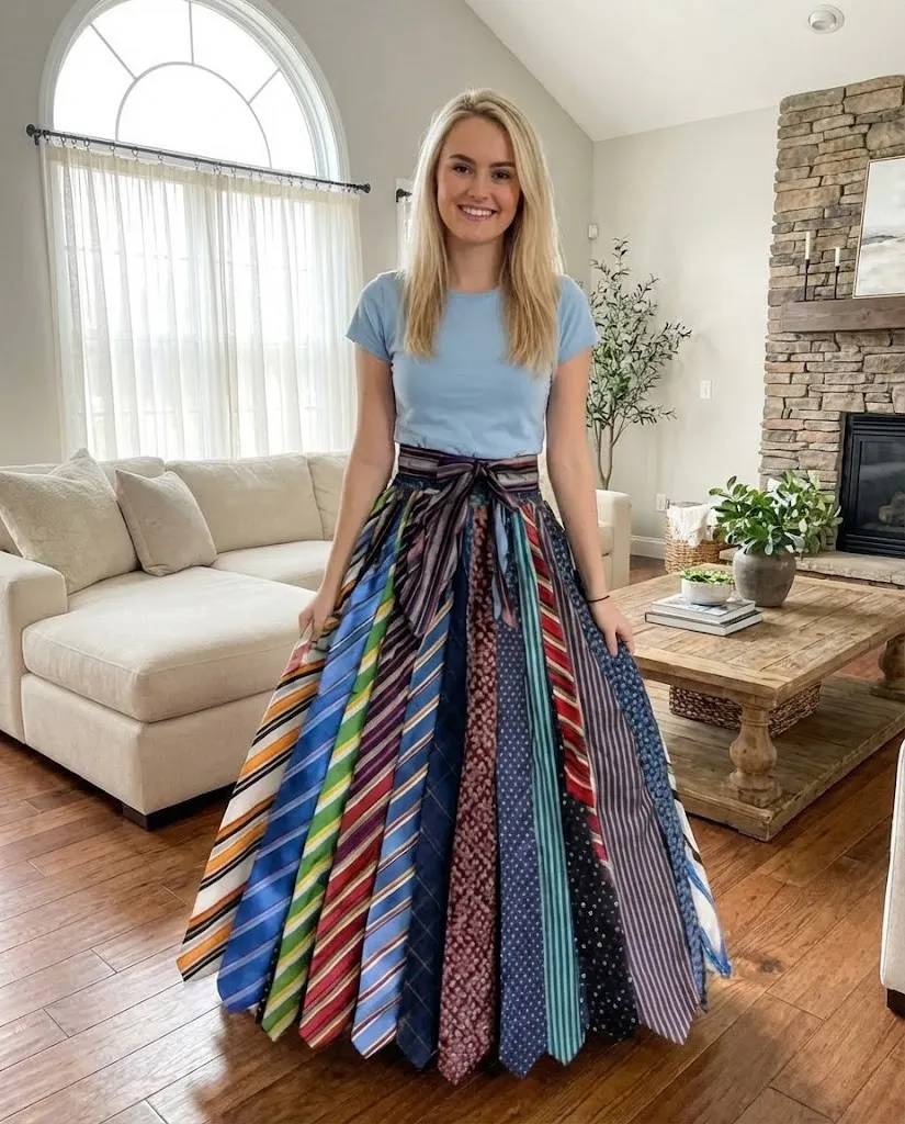 When my father died, the world dimmed into a silence that felt too heavy for a teenager to hold. He had been the center of gravity in every stage of my life—the maker of too-sweet pancakes, the teller of embarrassing jokes, the dad who wrapped every victory and every failure in the same steady warmth. When he remarried Carla, the house grew colder, but I never imagined how icy it would become after he was gone. She mourned in a way that looked more like irritation than grief, and within days she began tossing out his belongings like clutter, including the ties he wore to every milestone of my childhood. I saved them in secret, stitching them into a skirt that felt like carrying him with me, every colored panel a heartbeat woven into silk.
