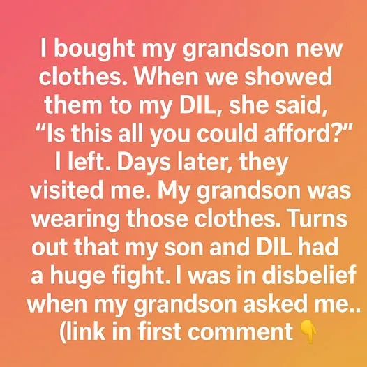 I bought my grandson some new clothes. Nothing expensive, just a few nice shirts and pants that I thought he would look handsome in. I was excited to see him wear them, but when we showed them to my daughter-in-law, she frowned. “Is this all you could afford?” she asked, her voice sharp. The words stung more than I could admit. I didn’t want to cause a scene, so I quietly excused myself and went home. But her comment stayed with me, echoing in my heart.