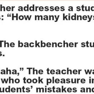 “And for me, a coffee!” the backbencher student remarked. The teacher was enraged and booted the kid out of the classroom. Leaving the class, the student still had the arrogance to correct the enraged teacher: “You asked me how many kidneys’ we have.”