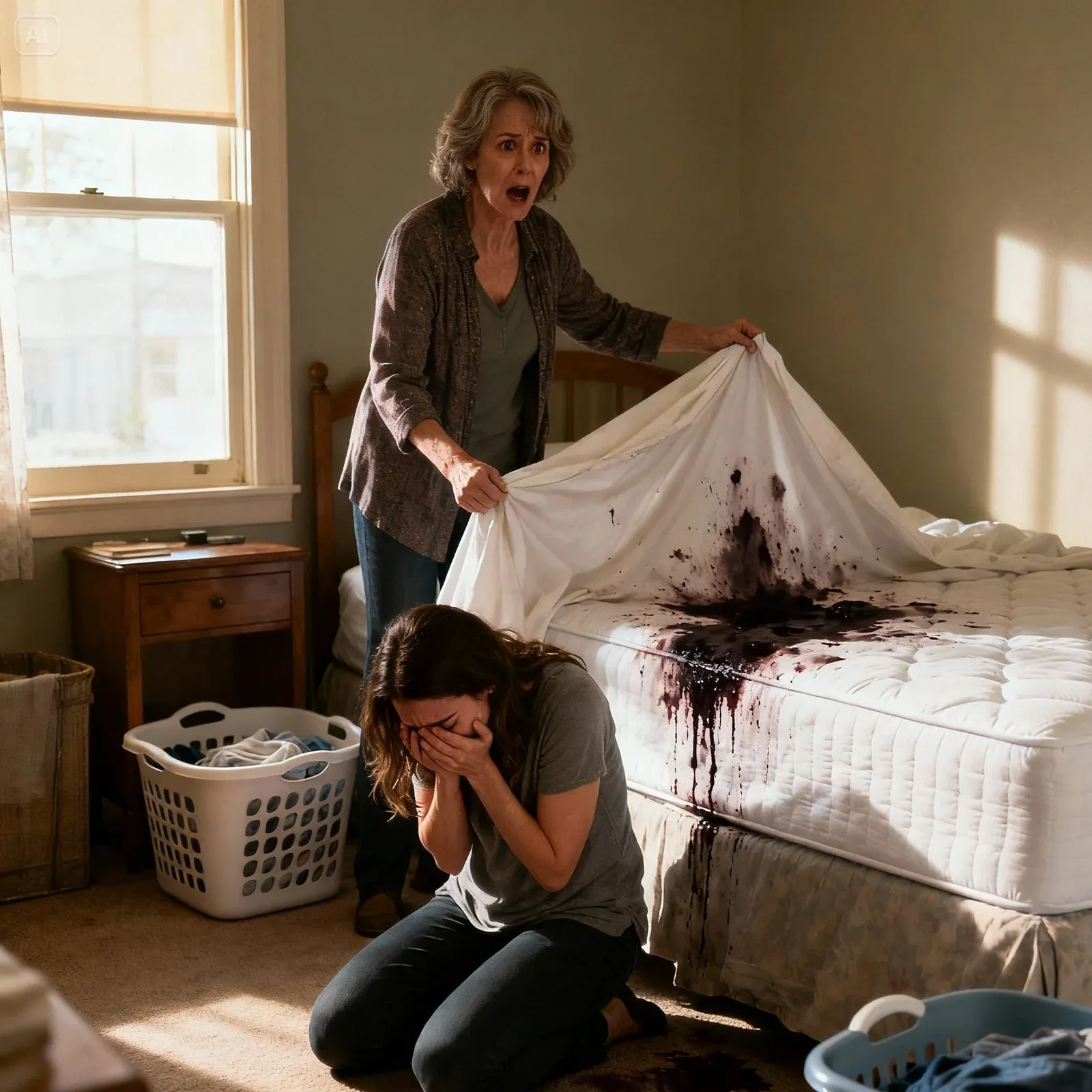 One day, unable to quiet the dread gathering in my chest, I pretended to drive to town, then slipped back quietly to the guesthouse. The moment I stepped inside, the metallic scent hit me like a blow. When I lifted the blanket, I froze—dark, heavy stains soaked deep into the mattress, thick enough to make my heart pound with terror. Blood. Not a smear, not an accident—an amount no one could ignore. My hands shook, my breath faltered, and possibilities—nightmarish, violent, unthinkable—raced through my mind. When I confronted Emily days later, opening a drawer filled with bandages, antiseptic, and a shirt stiff with dried blood, she broke. With tears streaming down her face, she whispered the truth: Michael was dying. Leukemia. Terrible, merciless, and slowly consuming him from the inside out. The bleeding came from his gums, his nose, sometimes even while he slept, and she had been hiding it to honor his wish—he didn’t want me to drown in worry.