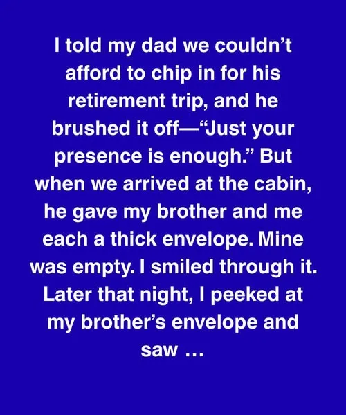 By Sunday afternoon, the secret gnawed at me until I pulled Rachel aside over dinner at the rickety cabin table. “I think Dad gave Patrick fifteen thousand,” I whispered, my voice thick with shame. “But my envelope… it was blank.” Rachel sighed, her hand on mine. “Maybe he has something different planned for you,” she offered gently. I tried to believe her, but I couldn’t shake the wounded ache of being overlooked.