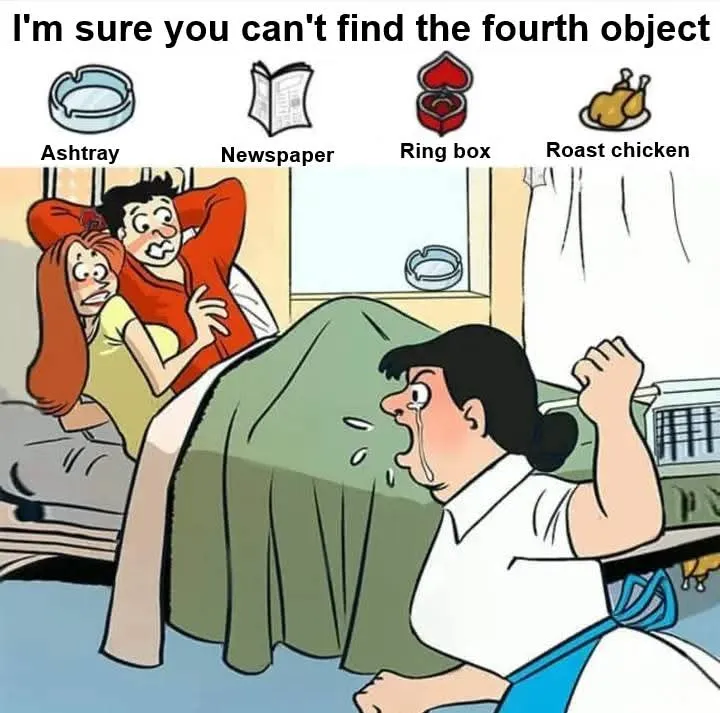 Ashtray: This object is arguably the easiest of the four to spot. Look closely at the windowsill behind the bed; the ashtray’s clear, rounded shape makes it distinct, provided you’re attentive to your surroundings. This highlights the importance of perspective in puzzles, as sometimes the most obvious objects are the hardest to notice due to placement. Newspaper: Don’t underestimate this sneaky item! It has been cleverly integrated into the top edge of the white curtain on the right side of the image. The newspaper’s grayish hue blends almost perfectly with the fabric, making it a challenge to find unless you meticulously scan every inch of the scene. This particular item is a perfect example of how color can play tricks on the eyes. Ring Box: For this item, you’ll need to direct your attention to the red hair of the woman on the bed. A small heart-shaped design is cleverly hidden within her hairstyle, representing the ring box. Its placement is so subtle that it requires a discerning eye to notice. This serves as a reminder of how everyday objects can become part of a larger visual tapestry. Roast Chicken: The most elusive of the bunch! This delicious item lies beneath the bed, near the feet of the enraged woman. Shaded in warm brown tones, it is deliberately camouflaged with the darker area under the bed, making it difficult to detect at first glance. The darker visuals beneath the bed symbolize how easy it is to overlook what is literally beneath our feet.