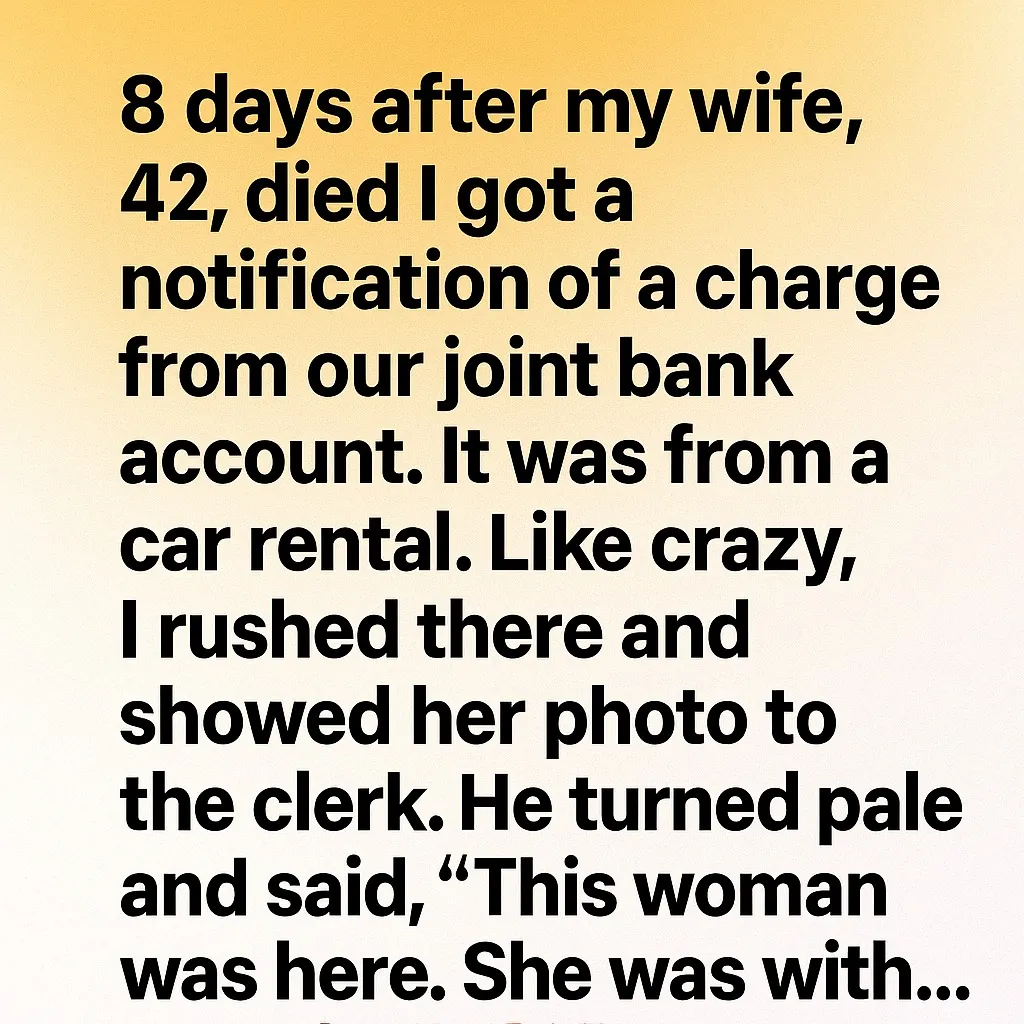 The notification arrived without ceremony, a small line of text glowing on my phone eight days after the funeral, when silence had begun to feel like a second skin. A charge from our joint account. A car rental. My breath caught as if grief itself had learned a new way to hurt me. I stared at the screen, waiting for logic to intervene, for reason to announce itself and restore order. Instead, panic took the wheel. I drove to the rental office with her photo open on my phone, clutching it like evidence against the impossible, telling myself this was just another administrative ghost left behind by death.