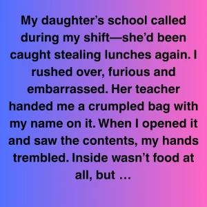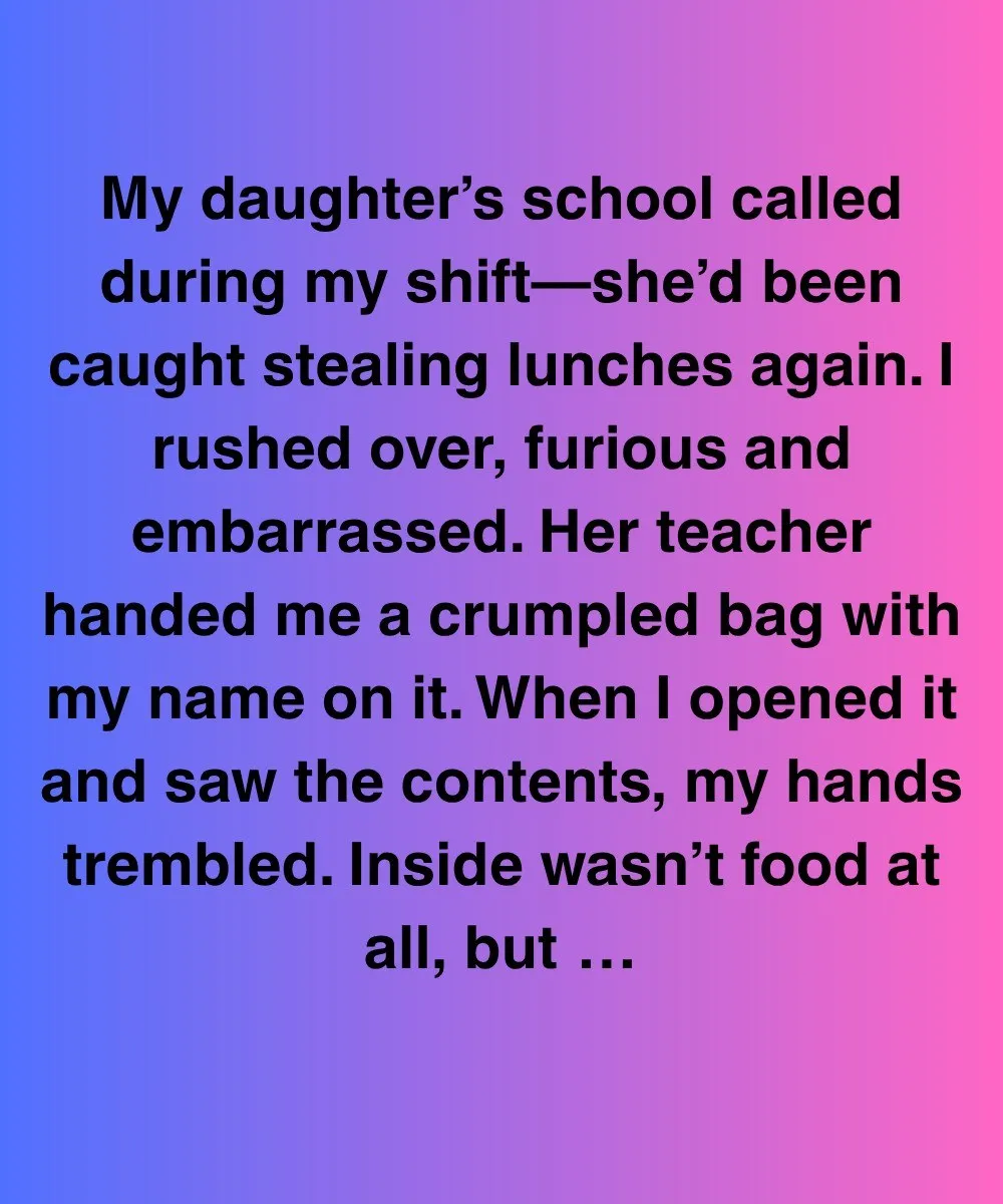 My daughter’s school called during my shift—she’d been caught stealing lunches again. I rushed over, furious and embarrassed. Her teacher handed me a crumpled bag with my name on it. When I opened it and saw the contents, my hands trembled. Inside wasn’t food at all, but three folded pieces of notebook paper with my handwriting on them.