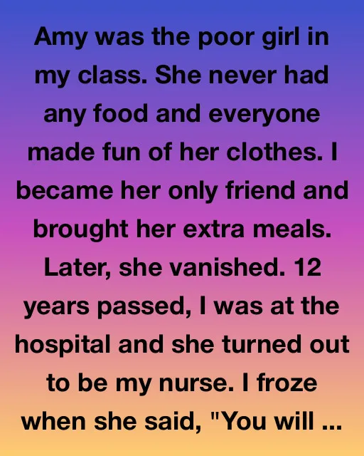 I couldn’t believe what I was hearing. Amy, the girl who wore oversized shoes and never brought lunch, was now a nurse—confident, calm, and kind.