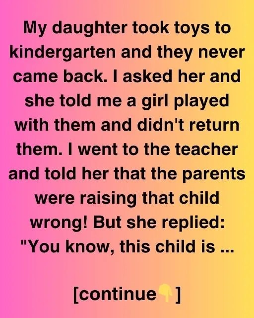 My daughter took toys to kindergarten and they never came back. I asked her and she told me a girl played with them and didn’t return them. I went to the teacher and told her that the parents were raising that child wrong! But she replied: “You know, this child is going through something difficult at home.”