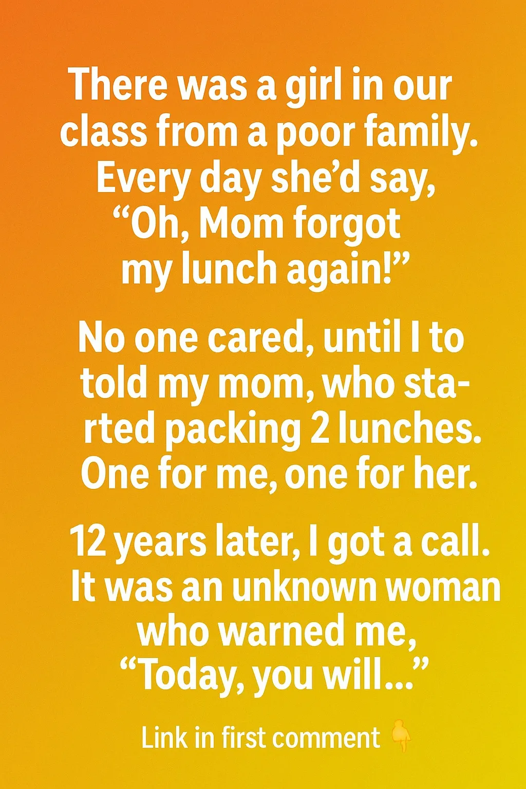 Eventually, school ended. We went to different high schools, then college, and life swept us along. I hadn’t thought about her in years until one morning, my phone rang with a number I didn’t know. Her voice on the other end was soft but steady. “I don’t know if you remember me,” she said, “but I’ve never forgotten you.” She told me that back then, her mom was struggling—two jobs, no car, sometimes no dinner waiting at night. Those lunches weren’t just food; they were proof that someone saw her, that she mattered. “You made me feel like a person who belonged,” she said. I didn’t know what to say except thank you for remembering.