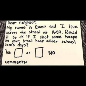 To her surprise, when she opened her mailbox later, she discovered a genuine and kind reply from her neighbors. They not only gave her permission to use the basketball hoop, but they also encouraged her to have fun!
