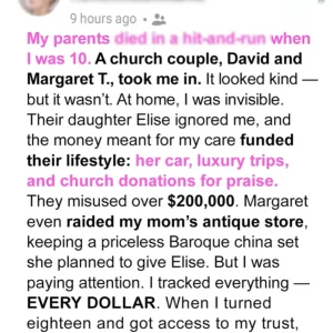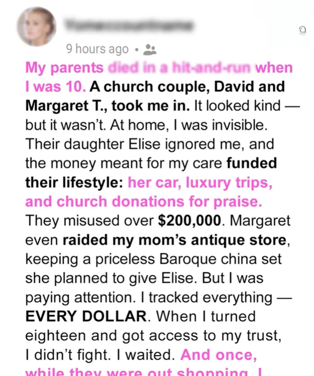 My parents died in a hit-and-run when I was 10. A church couple, David and Margaret T., took me in. It looked kind but it wasn’t. At home, I was invisible. Their daughter Elise ignored me, and the money meant for my care funded their lifestyle: her car, luxury trips, and church donations for praise. They misused over $200,000. Margaret even raided my mom’s antique store, keeping a priceless Baroque china set she planned to give Elise. But I was paying attention. I tracked everything – EVERY DOLLAR. When I turned eighteen and got access to my trust, I didn’t fight. I waited. And once, while they were out shopping I snuck into Margaret’s study and took photos of every document I could find. Bank statements, receipts, even a little notebook with all their expenses jotted down in Margaret’s loopy handwriting. It felt like holding my whole childhood in my hands.