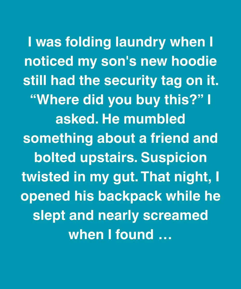 I was folding laundry when I noticed my son’s new hoodie still had the security tag on it. “Where did you buy this?” I asked. He mumbled something about a friend and bolted upstairs. Suspicion twisted in my gut. That night, I opened his backpack while he slept and nearly screamed when I found a handful of new clothing tags, three more security-wrapped shirts, and a store receipt with the barcode blacked out.