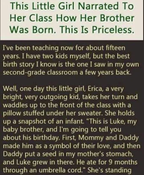 I have two kids myself, but the best birth story I know is the one I saw in my own second grade classroom a few years back. When I was a kid, I loved show-and-tell..