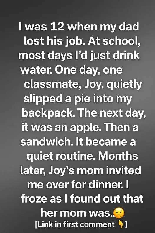One ordinary afternoon, I unzipped my backpack and froze. Inside was a small pie, still warm, wrapped carefully in foil. I stared at it, stunned. I hadn’t packed it, and my mom certainly hadn’t either—we barely had enough food for dinner most nights. Confused, I looked around the classroom, but no one seemed to be paying me any attention.