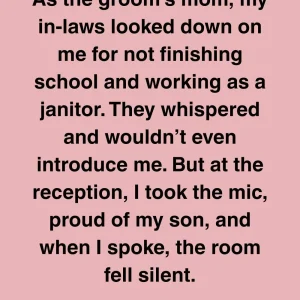 As the groom’s mom, my in-laws looked down on me for not finishing school and working as a janitor. They whispered and wouldn’t even introduce me. But at the reception, I took the mic, proud of my son, and when I spoke, the room fell silent.