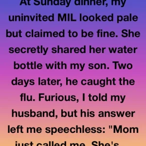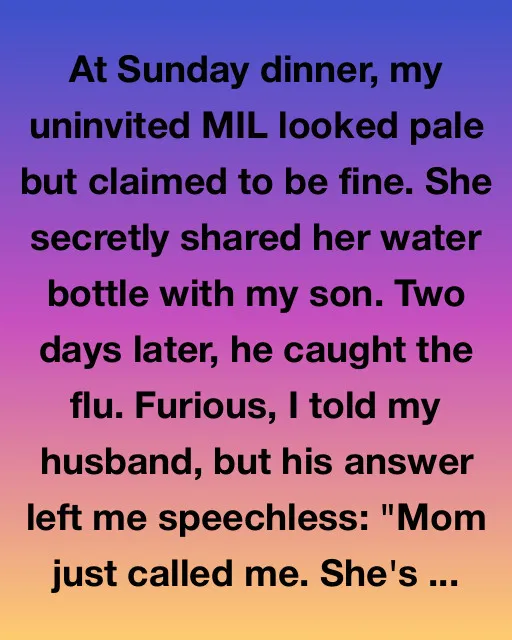 At Sunday dinner, my uninvited MIL looked pale but claimed to be fine. She secretly shared her water bottle with my son. Two days later, he caught the flu. Furious, I told my husband, but his answer left me speechless: “Mom just called me. She’s in the hospital.”
