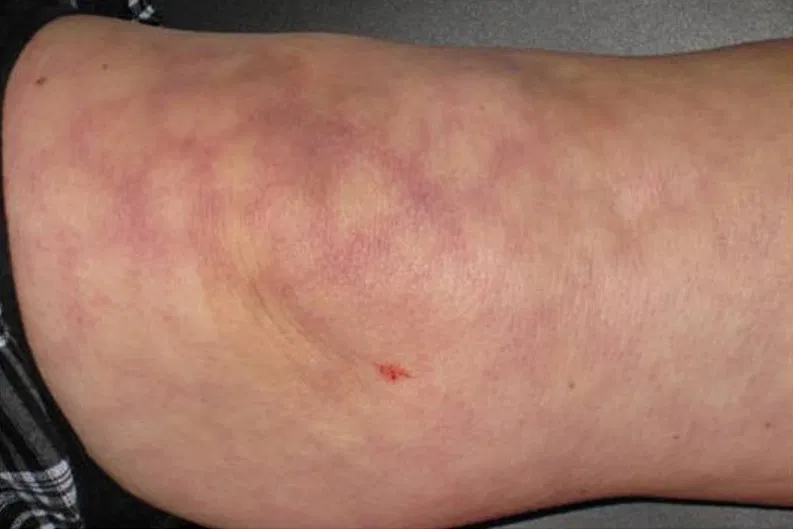 Livedo reticularis is characterized by a mottled, web-like pattern of reddish-blue or purple discoloration that usually appears on the legs, arms, or trunk. The condition happens when bl00d flow through the small bl00d vessels under the skin is interrupted, slowed, or uneven, causing a pooling of deoxygenated blood. The discoloration typically becomes more noticeable in cold weather and may fade when the skin warms up.