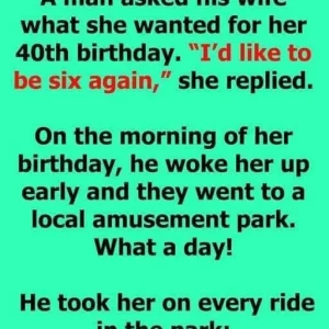 A man asked his wife what she wanted for her 40th birthday. “I’d like to be six again,” she replied. On the morning of her birthday, he woke her up early and they went to a local amusement park. What a day! He took her on every ride in the park: