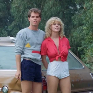 One of the intriguing moments the film covers is a photo of the lead actor Lynda Wiesmeier posing alongside her co-star, both dressed in retro fashion. At first glance, it resembles a typical 80s snapshot. The man sports a gray sweatshirt adorned with colorful shapes and dark shorts, while the woman flaunts a bright red shirt tied at her waist paired with high-waisted white shorts.