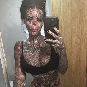 Now, with jet-black locks, extensive ink, and striking body modifications, she confidently flaunts her look in tiny bikinis and embraces her new identity.