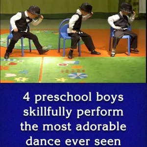 Playful piano music can be heard playing as a group of preschool boys begin their performance. One boy comes out carrying his chair and he puts it on the ground so he can sit on it.